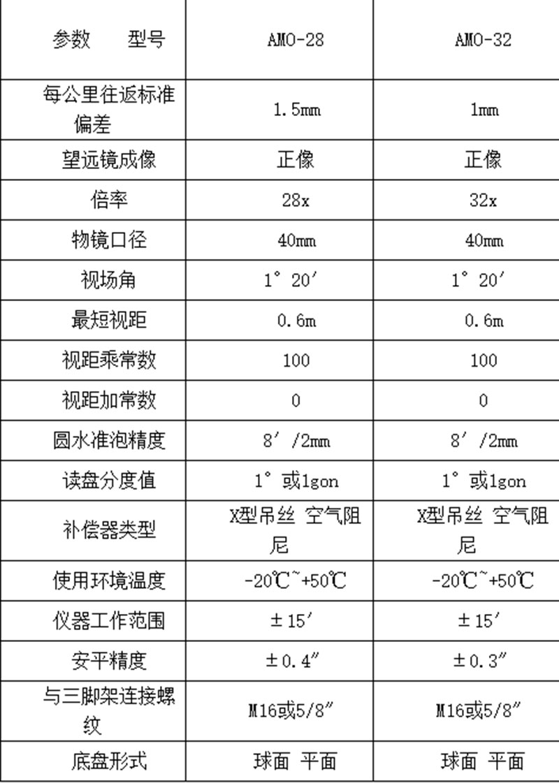 每公里往返標準偏差prefix=st1 ns="urn:schemas-microsoft-com:office:smarttags"1mm望遠鏡成像正像倍率32x物鏡口徑40mm視場角1°20′最短視距0.65視距乘常數(shù)100視距加常數(shù)0圓水準泡精度8′/2mm讀盤分度值1°補償器類型X型吊絲空氣阻尼儀器工作范圍±15′安平精度±0.3″與三腳架連接螺紋M16底盤形式球面平面