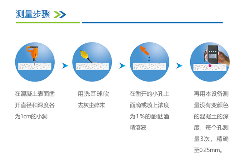 混凝土澆筑成型后,其中的Ca(OH)2與空氣中的CO2或水分中溶的CO2反應生成CaCO3而失去堿性的過程。測量原理是通過酚酞溶液遇堿變紅色的特性,測量碳